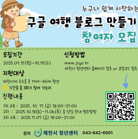 참여자 모집 기한은 10월 15일까지로 20명 선착순 접수하며, 제천시에 주소를 둔 19세~45세 청년 누구나 무료 참여 가능하다. 접수는 제천시 청년센터 누리집 프로그램 안내에 게시된 ‘네이버폼’을 통해 신청할 수 있다.