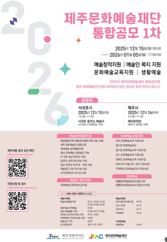 예술창작지원 분야는 ▲예술창작활동지원(A/B형) ▲제주원로예술인활동지원 ▲장애예술창작활동지원 ▲청년문화예술처음발표지원 ▲K-아트 청년 창작자 지원 ▲공연장 상주단체 육성지원 ▲공공 공연장 연계 창·제작 지원 ▲예술공간 이아 전시실 대관 ▲산지천갤러리 전시실 대관을 공모한다.