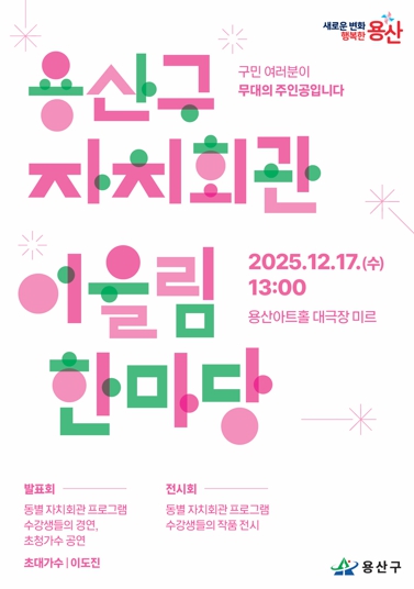 행사는 자치회관 프로그램 발표회와 작품 전시, 축하공연 등으로 구성되며, 용산구민과 자치회관 관계자 등 500여 명이 참석할 예정이다.