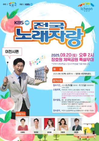 이번 ‘KBS 전국노래자랑–이천시편’ 참가 신청은 9월 12일 오후 6시까지 가까운 읍면동 행정복지센터를 방문하거나, 이천시 누리집(이천소식'알림사항'공지사항)에서 서식을 내려받아 이메일 제출로 할 수 있다. 이와 함께 이천시 농업정책과 유선 접수도 가능하다. 참가 예심은 9월 18일 오후 1시 장호원 국민체육센터에서 진행된다.