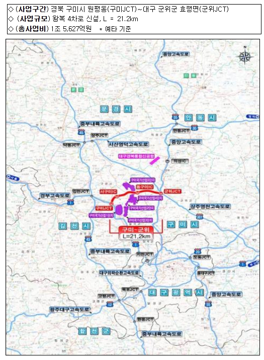 구미-군위 고속도로 건설사업은 경북 구미시에서 대구시 군위군을 잇는 왕복 4차로 고속도로를 건설하는 사업으로,국토교통부는 대구·경북 통합신공항 이전에 따른 교통수요 대응과 구미 국가산업단지 물류 수송 지원을 위해 제2차 고속도로 건설계획(’21~’25)에 해당 노선을 반영(’22.1)한 바 있다.