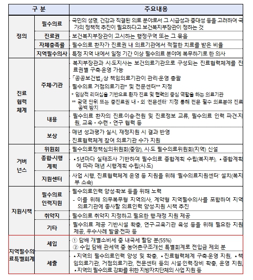 특히, 법 통과 이후부터는 복지부와 시‧도 간 ‘(가칭)지역필수의료법 정례협의체’를 구성하여, 필수‧공공의료 투자 방안과 하위법령 제정 등 구체적인 실행계획을 심도 있게 논의할 계획이다.