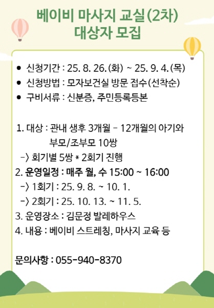모집 대상은 관내 생후 3~12개월 아기와 부모 또는 조부모 10쌍이며, 선착순으로 접수받는다.