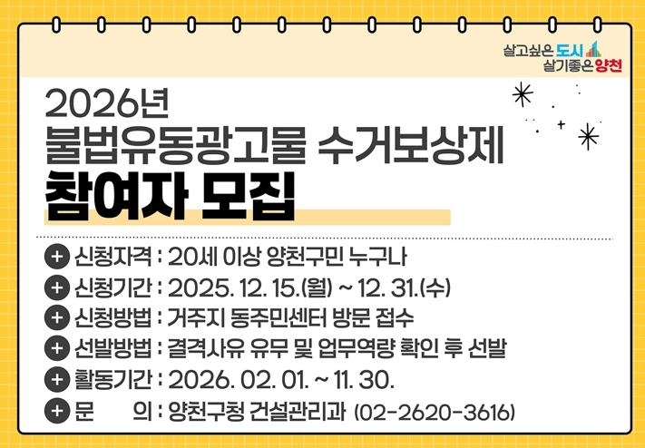 양천구는 2015년부터 불법유동광고물 수거보상제를 운영해왔으며, 이를 통해 최근 3년간 약 700만 장의 불법광고물을 정비했다. 이외에도 특별단속반 운영, 자동경고전화(ARS) 발신시스템, 불법광고물 흔적지우기 프로그램, 저단형 현수막지정게시대 설치 등 다양한 정책도 추진하고 있다.