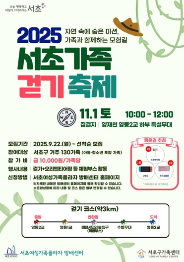 전성수 서초구청장은 “지난 ‘2023년 서초가족 걷기축제’에서 보여준 주민들의 큰 호응이 이번 축제 재개최로 이어졌다”며, “올해도 모두가 양재천을 즐겁게 걸으며 온가족이 함께 만들어가는 서초형 친환경 걷기 문화가 정착되길 바란다”고 전했다.