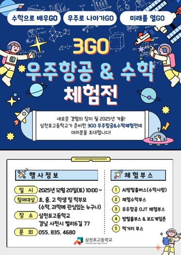 삼천포고등학교 관계자는 “이번 체험전은 교과서 속 수학과 과학이 실제 산업과 미래 기술로 어떻게 연결되는지를 직접 느낄 수 있는 자리”라며 “학생들이 즐거운 경험 속에서 자연스럽게 진로와 꿈을 설계하는 계기가 되길 바란다”고 말했다.