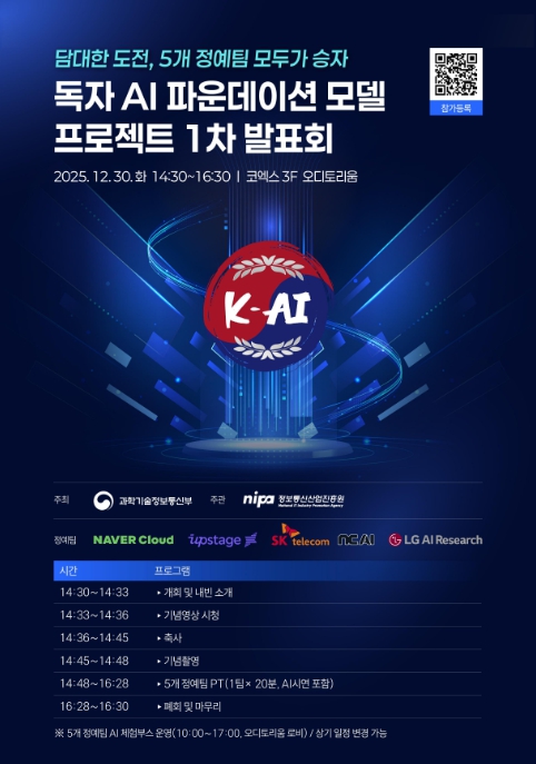 한편, 「독자 AI 파운데이션 모델」 프로젝트의 1차 단계평가는 `26년 1월 15일 이내 추진하며, 정예팀들의 성과·계획 등을 종합 점검·평가할 예정이다.