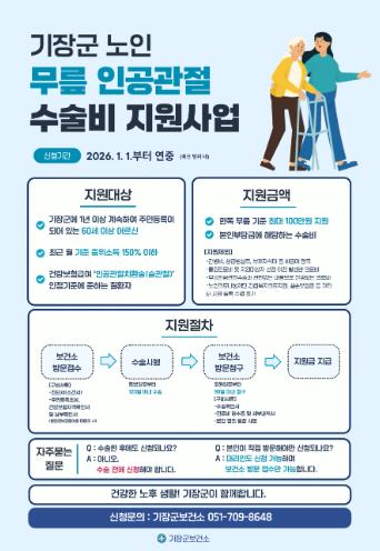 한편,‘무릎인공관절 수술비 지원사업’에 관한 자세한 사항은 기장군보건소 도시보건팀으로 문의하면 된다.