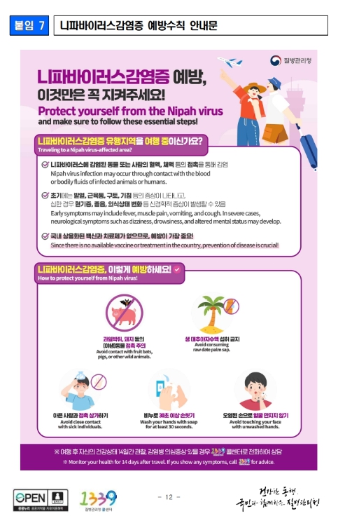 현재까지 국내에서 니파바이러스감염증이 발생한 사례는 없으나, 과일박쥐 서식 구역 내 아시아 국가들에서 산발적으로 발생하고 있으며, 특히 최근에도 인도와 방글라데시에서 환자 발생이 보고됨에 따라 해당 국가 방문 시 각별한 주의가 필요하다.