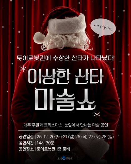 크리스마스 당일에는 ‘이상한 산타 마술쇼’가 펼쳐진다. 겨울 분위기에 어울리는 유쾌한 연출과 관객 참여형 구성으로 아이부터 어른까지 함께 즐길 수 있는 공연으로, 28일 주말까지 이어서 진행된다. 이와 함께 ▲산타와 함께 사진을 남길 수 있는 ‘이상한 산타와 한 컷’ ▲이상한 산타의 ‘선물 보따리’ 이벤트가 운영되며, 선물은 선착순 500명에게 제공되어 크리스마스 방문의 즐거움을 더할 예정이다.