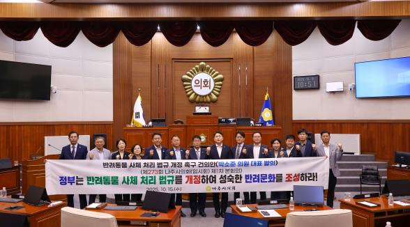 나주시의회는 건의안을 통해 ▲반려동물 사체를 폐기물이 아닌 장례의 개념으로 전환할 수 있는 법적 근거를 마련할 것과 ▲공공장례시설 확충 및 화장 장례비 지원 마련, ▲반려동물 입양 시 사체 처리를 포함한 윤리적 책임 교육을 의무화할 것을 강력히 촉구했다.