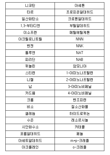 위원회는 검사의 대상이 되는 담배 유해성분 목록과 유해성분별 시험법도 의결했다. 이는 올해 행정예고(3월 6일부터 2개월)를 완료하고 현재 규제심사를 진행하고 있는'담배 유해성분 지정 등에 관한 규정'(식품의약품안전처고시)에 담겨 있다. ①유해성분의 경우, 궐련 및 궐련형 전자담배에 대하여는 타르 및 니코틴을 포함한 44종을, 액상형 전자담배에 대하여는 니코틴, 프로필렌글리콜, 글리세린 등 20종을 지정했다. ②시험법의 경우, 세계보건기구(World Health Organization, WHO), 국제표준화기구(International Organization for Standardization, ISO) 등 국제기구에서 개발된 표준시험법을 참고하여 마련했다.