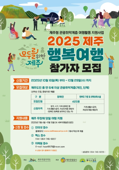 ‘제주 행복 여행’은 단순한 관광을 넘어 쉼과 힐링, 문화예술 체험이 어우러진 프로그램으로 구성됐다. 참가자는 웰니스 체험, 식사, 여행자보험 등 여행에 필요한 모든 비용을 지원받게 되며, 거동이 불편한 장애인 등은 보호자까지 지원받을 수 있다.