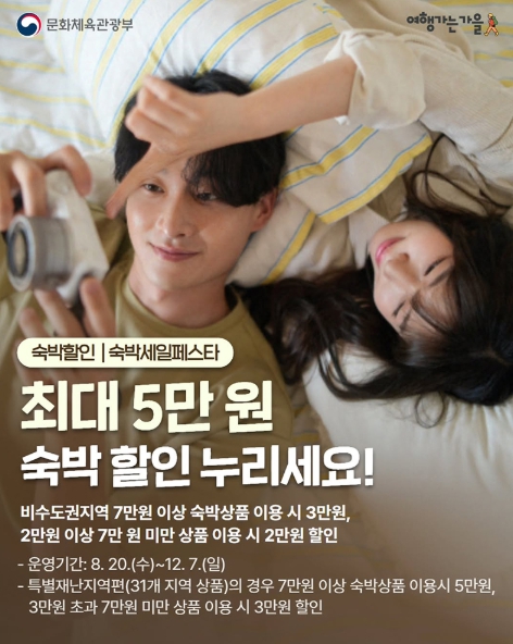 비수도권지역 7만 원 이상 숙박상품 이용 시 3만 원, 2만 원 이상 7만 원 미만 상품 이용 시 2만 원 할인 - 운영기간: 8.20.(수)~12.7.(일) - 특별재난지역편(31개 지역 상품)의 경우 7만 원 이상 숙박상품 이용시 5만 원, 3만 원 초과 7만 원 미만 상품 이용 시 3만 원 할인→숙박세일페스타 안내페이지