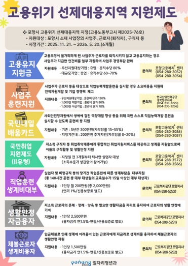 시는 고용노동부 포항지청, 근로복지공단, 산업인력공단, 포항상공회의소, 경북동부경영자협회 등과 ‘고용위기 선제대응지역 지원제도 실무협의체’를 구성, 정기적인 실적 점검과 현장 중심 홍보를 추진한다.