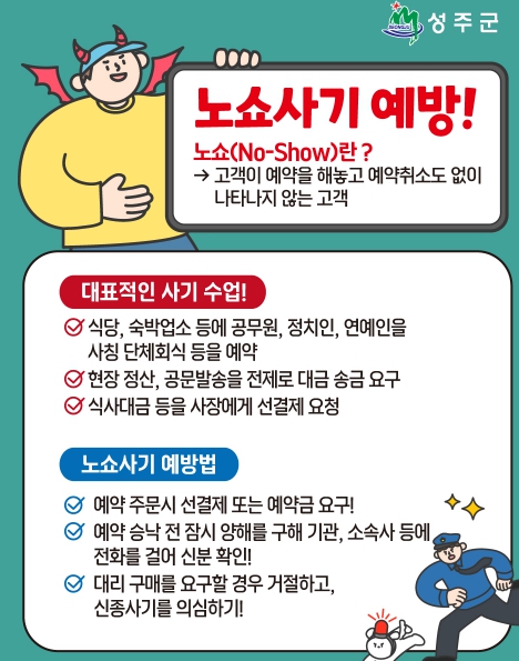 성주군은 이 외에도 홈페이지, SNS 등을 통해 예약부도 예방홍보 안내문을 게시하고. 의심 사례 발생 시 즉시 경찰(☎112)에 신고해 피해 예방에 도움을 받을 수 있도록 적극적으로 대응하고 있다.
