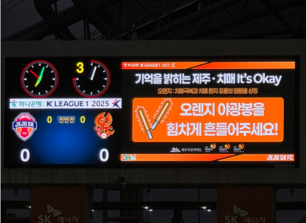하프타임에는 관중에게 오렌지색 응원봉이 배포됐고, 관중들은 ‘기억을 밝히는 제주’ 구호를 함께 외치며 치매 극복과 환자 포용을 기원하는 감동적인 장면을 연출했다.