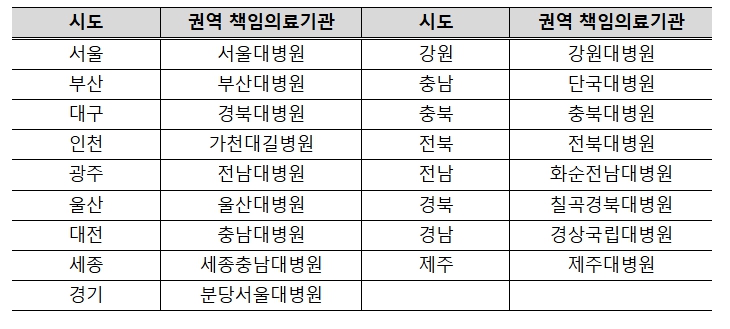 권역책임의료기관은 ▲고난도 필수의료 진료를 제공하고 ▲권역 내 의료기관 간 협력체계를 기획·조정하는 거점병원으로, ’19년부터 국립대병원을 중심으로 지정했다. ’25년 현재 17개 모든 시도에 권역책임의료기관이 지정 완료되어 권역의 필수의료 협력체계를 총괄 중이다.