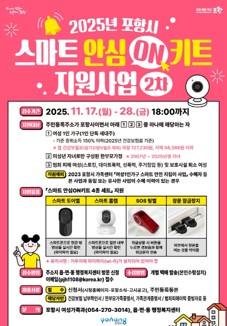 포항시는 지난 7월 실시한 1차 지원을 통해 40가구에 스마트 안심ON키트를 배부해 큰 호응을 얻었으며, 보다 많은 시민에게 혜택을 제공하기 위해 이번 2차 모집을 추진한다.