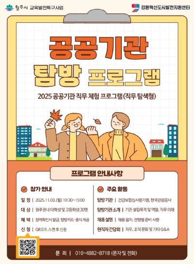 이번 프로그램은 지역 청년들이 강원혁신도시 내 주요 공공기관을 직접 방문하여 기관의 역할과 업무 환경을 체험하고, 공공분야 진출에 필요한 구체적인 정보를 얻을 수 있도록 기획됐다.