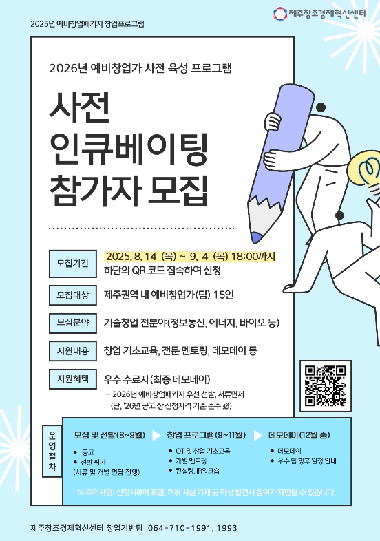 모집 대상은 공고일(8월 14일) 기준 신청자 명의의 사업자 등록 및 법인 설립 등기를 하지 않은 자다. 신청 기간은 내달 4일(목) 오후 6시까지이며, 자세한 내용은 제주센터 홈페이지 내 모집 공고문 및 포스터를 통해 확인할 수 있다.