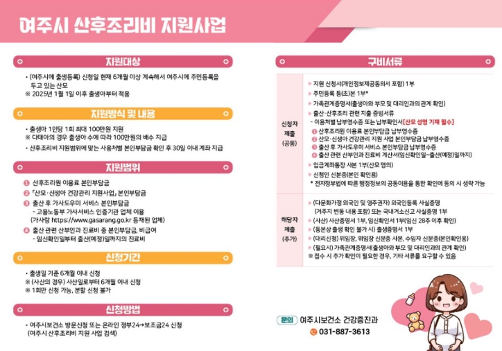 길혜란 건강증진과장은 “산후조리비 지원사업은 출산 이후 산모와 가족에게 실질적인 도움을 주는 정책으로 앞으로도 출산 친화적 환경 조성을 위해 체감도 높은 지원을 이어가겠다”라고 밝혔다.