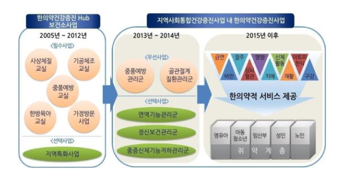 ‘한의약건강증진사업’은 2003년부터 전국 보건소를 중심으로 한의약 기반의 주민 밀착형 건강관리 서비스를 제공하는 사업이다. 만성질환 예방, 생활습관 개선, 갱년기 및 정신건강관리 등 일상 속 다양한 건강문제를 한의약적 접근으로 풀어나가며, 국민의 건강 수준 향상에 기여하고 있다.
