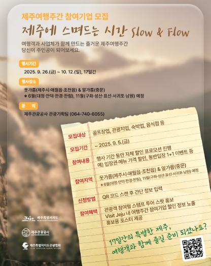 이번 가을 제주여행주간은 오는 26일부터 10월 12일까지 17일간 운영한다. 도와 공사는 ‘제주에 스며드는 시간, Slow&Flow’를 주제로 웃가름(제주시내, 애월읍, 조천읍)과 알가름(중문)을 중심으로 지역 특화 체험 프로그램과 다채로운 콘텐츠를 선보일 예정이다.