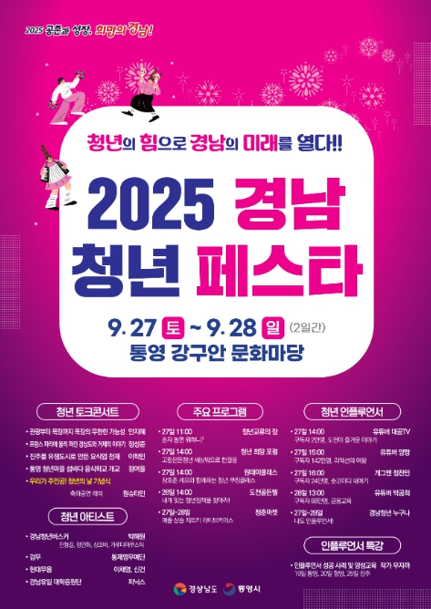 같은 날 문화마당 일원에서는 흑백요리사 프로그램에서 활약한 통영 출신의 장호준 셰프와 청년들이 함께하는 ‘청년 쿠킹클래스’가 진행되며, 구독자 142만 명을 보유한 인플루언서 양팡, 개그맨 정찬민 등이 정책부스를 돌며 도와 시군 청년정책을 홍보한다.