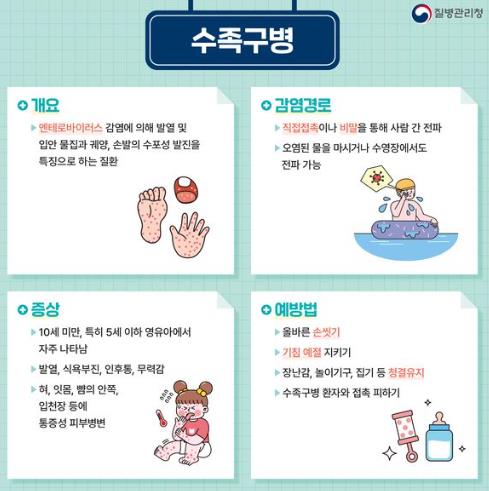 수족구병은 장바이러스(엔테로바이러스)로 인하여 발생하는 급성 바이러스성 질환으로 환자의 대변 또는 분비물(침, 가래, 콧물, 수포액 등)과 직접 접촉 시 전파된다.
