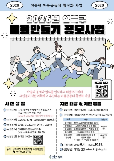 성북구는 주민들의 이해와 참여를 위해 사업 분야별 지원 조건, 사업 계획서 작성 방법 등을 안내하는 사전상담을 진행한다. 사전상담은 1월 15일부터 28일까지 온라인으로 신청할 수 있다.