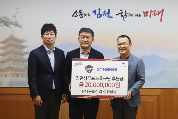 김천상무프로축구단이 8월 28일, 김천시청에서 (주)동희산업과 (주)에스비일렉트릭의 후원금 전달식을 진행했다. 행사에는 김천상무 이재하 대표이사와 동희산업 박주은 대표이사, 박치완 상무가 참석했다. 이어진 행사에는 에스비일렉트릭 김대견 대표이사, 서석년 고문이 자리했다.