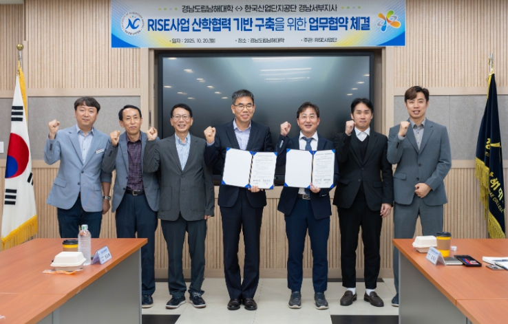 이날 협약식에는 남해대학 노영식 총장과 한국산업단지공단 경남서부지사 이강수 지사장을 비롯해 양 기관 관계자 10여 명이 참석한 가운데 진행됐으며, 한국산업단지공단 경남서부지사(지사장 이강수)와 손잡고 지역산업 수요 맞춤형 인재 양성과 산학협력 기반 구축에 나섰다.