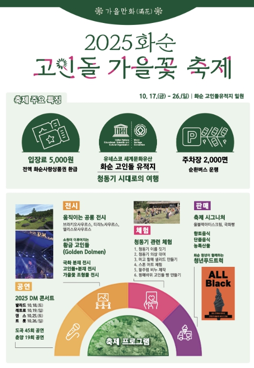 '2025 화순 고인돌 가을꽃 축제'에서는 휠체어(30대) · 유아차(30대) 대여 부스 2개소(도곡 1, 춘양 1)를 무료로 운영한다.