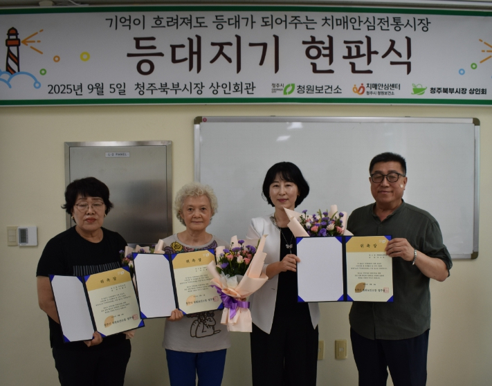 이날 청원보건소는 청주북부시장 치매안전망 구축에 적극 동참하는 상점 13곳을 치매안심등불로 지정하고, 대표자 3인에게 위촉장을 수여했다.
