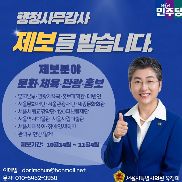 이번 제보창구는 “시민이 직접 서울시 행정을 감시하는 열린 감사”를 목표로 마련됐다. 서울시 본청과 산하기관의 예산 낭비, 행정 비효율, 부당한 업무처리 등 현장에서 체감되는 문제를 시민이 직접 제보하면, 이를 11월 행정사무감사 과정에서 실질적으로 다룰 예정이다.