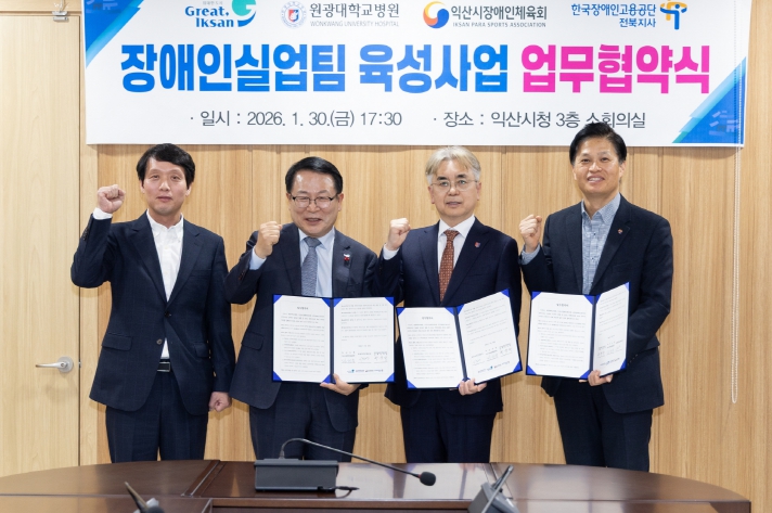 익산시는 30일 시청 회의실에서 원광대학교병원, 익산시장애인체육회, 한국장애인고용공단 전북지사와 함께 '장애인실업팀 육성 및 고용 활성화를 위한 업무협약'을 체결했다.