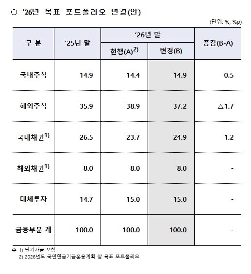 해외주식 목표비중이 조정됨에 따라 2026년 국내주식 목표비중도 당초 계획인 14.4%에서 14.9%로 조정(+0.5%p)되어 전년도 목표비중과 동일한 수준이 유지된다. 이는 기금수익률에 미치는 영향, 기존 기금운용 방향성 등을 종합 고려한 결과이다.