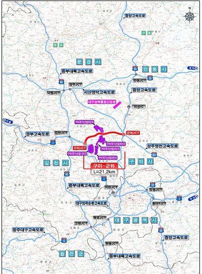 구미~군위 고속도로는 경북 구미시(경북고속도로 구미 나들목 인근 예정)에서 시작해 대구 군위군(중앙고속도로 군위 분기점)을 연결하는 총연장 21.2㎞의 4차로 고속도로를 신설하는 사업이다.