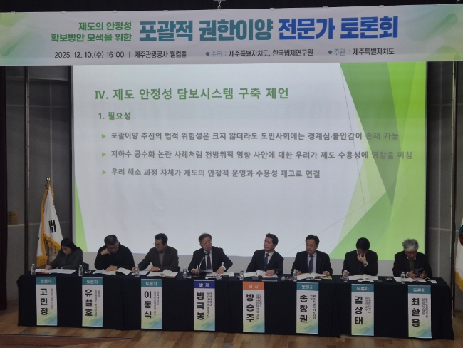 제주도는 10일 오후 4시 제주관광공사 웰컴홀에서 한국법제연구원과 공동으로 ‘포괄적 권한이양 안정성 확보 방안 마련을 위한 전문가 토론회’를 개최했다.
