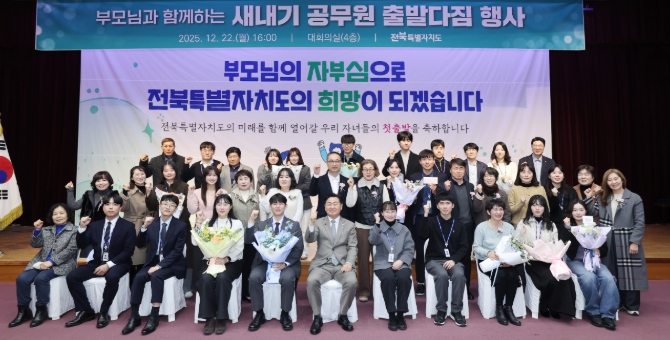 전북자치도는 22일 오후 도청 대회의실에서 새내기 공무원과 부모, 간부 공무원 등 200여 명이 참석한 가운데 ‘새내기 공무원 출발 다짐 행사’를 열고, 공직자의 길에 들어선 이들의 새로운 시작을 응원했다.