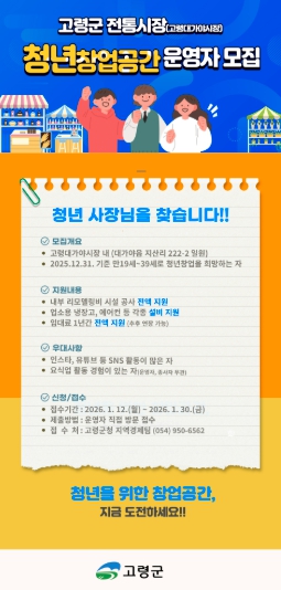 지역 대표 전통시장이자, 또 하나의 지역명소로 자리잡고 있는 고령대가야시장 내 새로운 활력 및 시장 이미지 개선을 도모하고, 청년층에 창업을 할 수 있는 기회를 제공하기 위한 본 사업은 지난 2024년 7월 4개 점포가 문을 연 데 이어, 2026년 고령군 청년창업공간의 확장 조성을 위해 금년 하반기 신규 2개소 추가 개점을 목표로 하고 있다.