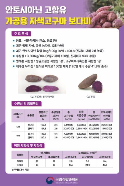 기존 자색고구마 ‘신자미’는 안토시아닌 함량이 많고 수량이 많지만, 저장 중 부패로 가공 원료로 활용하는 데 한계가 있었다. 반면 ‘보다미’는 부패율이 낮고 안토시아닌 함량이 ‘신자미’보다 약 2배 많아 가공적성이 우수하다. 덩굴쪼김병과 뿌리혹선충 등 병해충에도 저항성이 강하다.