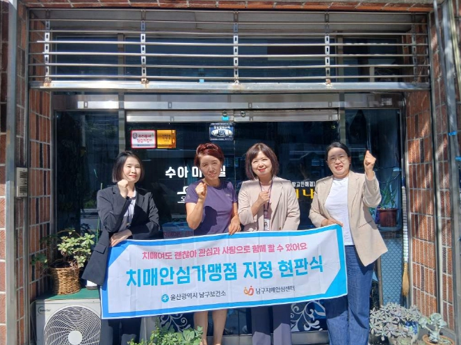 현재 남구에는 ▲세종문구서적 ▲삼호정추어탕 ▲삼호매일유통 ▲해정왕뽈떼기찜 ▲비케이로스터즈 ▲남성헤어전문 ▲소나무한의원 ▲새천년약국 ▲콩(커피) ▲씨앤씨안경원 ▲백조세탁 ▲평이용원 ▲홍서방네 ▲장생포 고래빵 ▲씨유울산강남월봉점 ▲어탕 & 국시집 ▲자연애마트 ▲마린보이 헤어나라 ▲신정할인마트 ▲팡팡 할인마트 ▲큰사랑 온누리 약국에 이어 신규 지정된 ▲수아미용실 ▲진정화로숯불구이까지 23개의 치매안심가맹점이 있으며 치매에 대한 올바른 이해와 인식개선을 위해 적극 참여하고 있다.