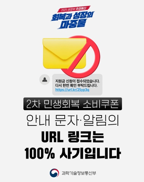 정부, 카드사, 지역화폐사 등은 2차 민생회복 소비쿠폰 온라인 신청 시 국민들의 스미싱 피해 예방을 위해 URL 링크 등이 포함된 문자메시지를 보내지 않습니다.