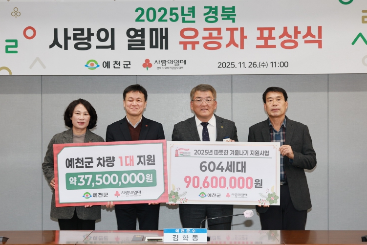 김학동 군수는 “경기가 어려운 시기임에도 기부문화 확산에 동참해 주신 우리 예천군민들께 감사드린다”며, “앞으로도 주변 이웃에 많은 관심을 부탁드리며, 군에서도 소외되는 이웃이 없도록 노력하겠다”고 말했다.