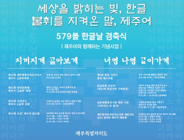 이번 경축식은‘세상을 밝히는 빛, 한글/불휘를 지켜온 말, 제주어’를 주제로 열린다. 한글이 세상을 밝히는 빛처럼 백성들의 어려움을 덜어주었듯 제주어는‘불휘’(뿌리의 옛말)라는 표현처럼 우리말의 소중한 뿌리를 간직해온 언어유산이라는 의미를 담고 있다.