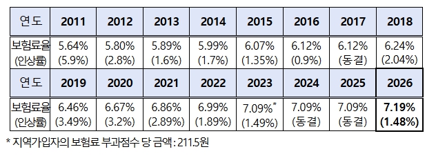 이번 결정으로 직장가입자의 월평균 보험료(본인부담)는 ‘25년 15만 8,464원에서 ’26년 16만 699원으로 2,235원 인상되며, 지역가입자의 월평균 보험료는 ’25년 8만 8,962원에서 ‘26년 9만 242원으로 1,280원 인상된다.
