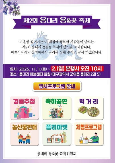 용대리는 마을만들기 사업을 통해 바보센터, 바보마을쉼터 등을 조성, 향후 주민 주도의 사업 추진을 위한 주민 역량 강화에도 힘을 쏟았으며 이를 토대로 군위의 대표 관광지인 마을을 널리 알리기 위해 이번 축제를 기획하게 됐다.
