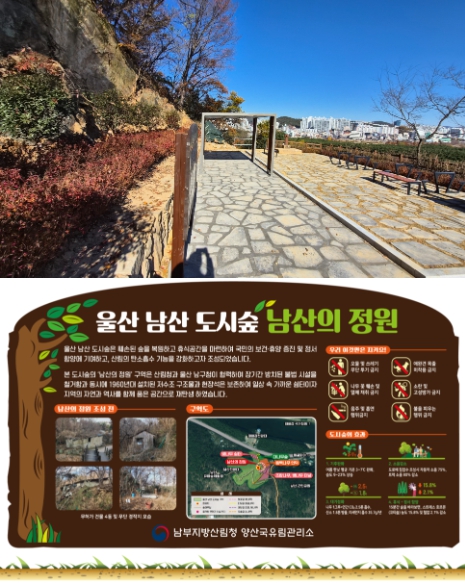 올해 1월, 양산국유림관리소와 울산 남구청의 실무협의회를 시작으로 울산광역시 남구 무거동 산86번지 일원의 불법건축물 4동을 합동 철거하고, 태화강 국가정원, 남산 색입히기 사업 등 지역 역점사업과 연계한 국민체감형 도시숲을 조성하고 있으며, 올해 12월에 완공될 예정이다.